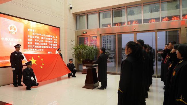 仪式现场,在院党组书记、院长李柏定的带领下,全体员额法官身着法袍,整齐列队,高举右拳,以铿锵有力、掷地有声的誓言作出了忠于宪法、忠于祖国、忠于人民的郑重承诺,表达了公正司法、司法为民的坚定决心。